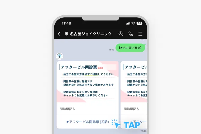 トーク画面のメニューから「アフターピル処方」を選び、Web問診票(生理周期や性行為の日時など)にご回答ください。