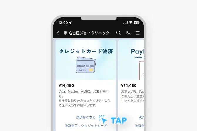 診察終了後、決済用リンクをお送りします。当院では、患者様のご都合に合わせて4つの支払い方法をご用意しています。