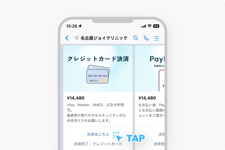 次にご希望のお支払い方法を選択し、決済を行なってください。決済が完了しましたら、「決済完了」をタップしてください。